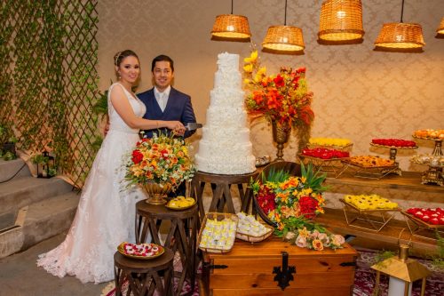 Michele Floriano e Gustavo Maehara, durante os festejos do casamento deles. Detalhe: a bonita decoração do evento foi elaborada pela famosa decoradora de festas Marilu Maldaner