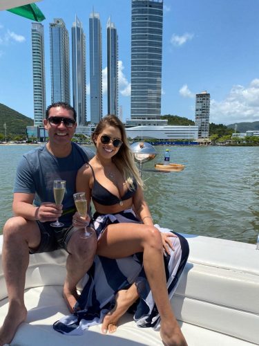 O médico Roberto Freitas aniversariou dia cinco e fez questão de comemorar a data, com champagne francesa, ao lado da bela namorada Karina Lopes, durante passeio pelos mares de Balneário Camboriú