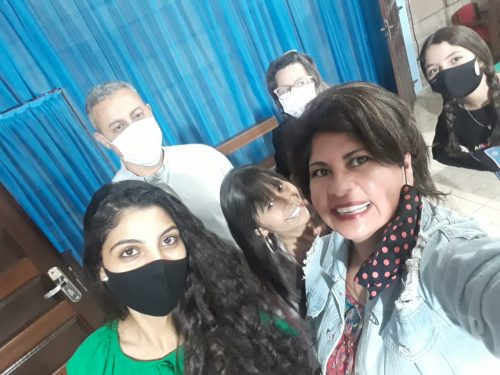 Frei Miguel (último frei da Ordem Franciscana a atuar na Igreja do Navio), Claudia Neto Córdova, Elizabete Oliveira, Maria Eduarda e Manuela, com a mamãe Luciana Xavier, durante a celebração de domingo (24.1), integrantes do Grupo Paz e Bem