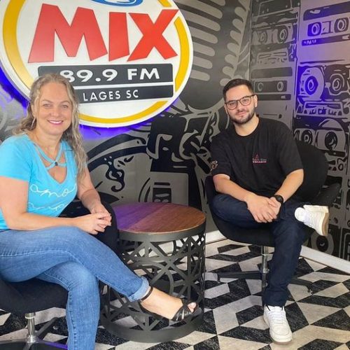 Débora Bombílio trocou de idade recentemente. Nesta imagem, a jornalista que apresenta audível programa na Mix FM, está Diogo Schimitz , em entrevista sobre o Colégio Santa Rosa de Lima