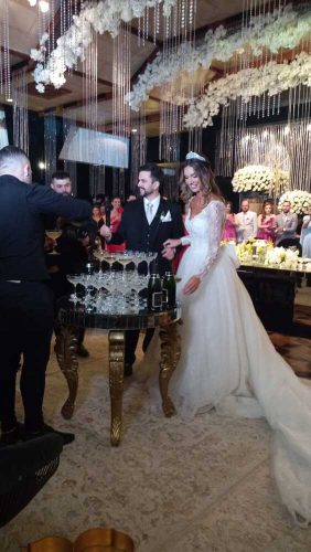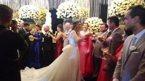 Foi um casamento pensado detalhe a detalhe. Trezentos convidados, de Urubici, Lages, São Joaquim, Florianópolis e outras cidades, lotaram o chique Serrano que foi tomado por um requinte indescritível! A famosa empresa de Juliano Quevedo, que nasceu em Alfredo Wagner e mantém escritório na Região Metropolitana de Florianópolis, e que já assina belas festas por todo o Brasil, foi responsável pela produção do evento. Decoração, extremamente clássica, inspirada nas grandes festas palacianas da França, teve o salão principal Serrano todo revestido com veludo italiano verde-esmeralda, a cor que predominou o evento que ganhou como contraste, o branco que fizeram o entorno dos móveis clássicos e espelhados colocados em todos os ambientes. E, por preferência da noiva Priscila, que ama rosas brancas, foram utilizadas quinze mil rosas em toda a festa! O salão principal foi coberto por trilhos de flores aéreos com franjas de cristais, ou melhor, uma linda chuva de cristais swarovski!