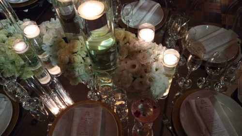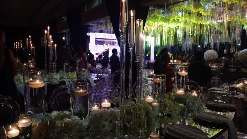 As mesas ocupadas pelos convidados, algumas ovais, outras, redondas cobertas por toalhas em veludo verde-esmeralda. Havia mesas espelho e translúcidas, ao centro, arranjos floridos e profusão de velas em cilindros de vidro. Fiquei sabendo que foram utilizadas mil velas na decoração!