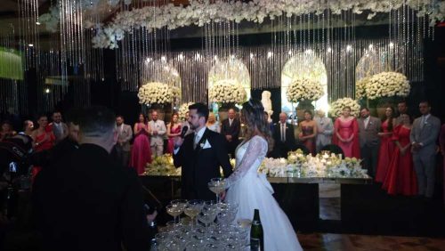 Primeiro, os convidados foram recebidos no Bar de Drinks, onde atenciosos barmans preparavam os mais bonitos e bem decorados coquetéis feitos à base de frutas. O copeiro serviu-me o drink da noiva, espumante batido com morango, bola de gelo flutuante. Havia drink do noivo, sucos decorados, espumantes, whisky, vodka…
