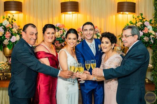Daiana e André fazem o brinde dos noivos com os pais, Vanuza Aparecida Pereira de Souza e Daniel Antunes de Arruda, Maria Gorete Alano Alves e Ari Dizon de Oliveira Alves!