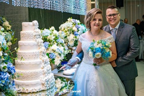 Vilma Gisele Karsburg e Lucas Gustavo Oliveira de Braga celebraram seu casamento em linda cerimônia, realizada na Igreja Luterana e conduzida pelo Pastor Marcos. A recepção aconteceu no Salão Sagrado Coração de Jesus, onde o ambiente foi transformado pela designer Marilu Maldaner, da Marilu Decoração e Eventos. O espaço ganhou toque encantador com a combinação de tons azul serenity, branco, prata e cristais com arranjos de hortênsias e rosas, criando cenário de beleza e sofisticação.