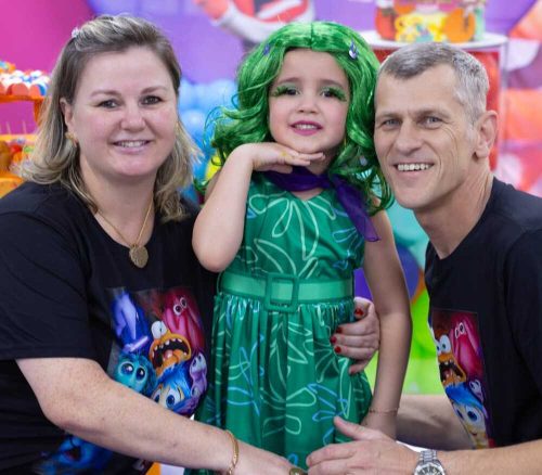 Sob o tema “Divertidamente”, Helena Medeiros Viapiana ganhou linda festa, pela chegada de seus seis anos! Nessa imagem, a aniversariante aparece com os faceiros avós Andreza Medeiros Viapiana e Fabrício Viapiana!