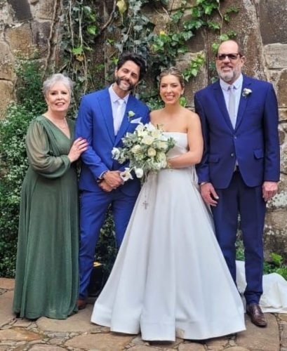 Os noivos Rafaela Rabello Reis e Michel Gonçalves Dias, com os pais dela, Sandra Rabello e Maurício Ribeiro Reis, durante o bonito casamento, em Floripa!