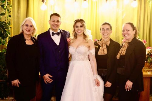Os noivos Taize Becher e Alan Bastos, com a equipe de cerimonialistas Novo Brilho, onde estão: Simone Sá e assessoras Gabriela e Renata, responsáveis pelo bonito cerimonial do casamento!