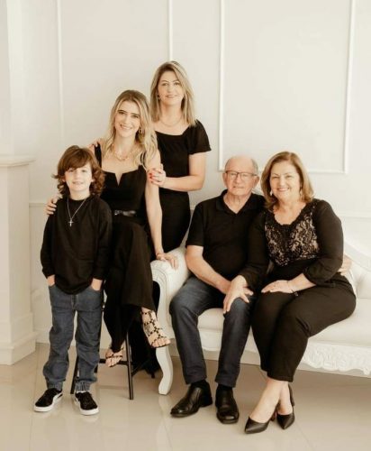A tia da formanda Luana Boufleur Lins, o avô de Allana, Dirceu José Boufleur, a formanda Allana Boufleur de Jesus Ferreira, a avó Sandra Maria Boufleur e a tia Bianca Boufleur, com a faceira mamãe Pâmela Boufleur