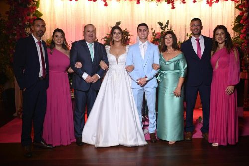 Os noivos Sara a Nathan, com a família dela: João, Bruna, Marcelo, Sara, Nathan, Rose, Augusto e Priscila