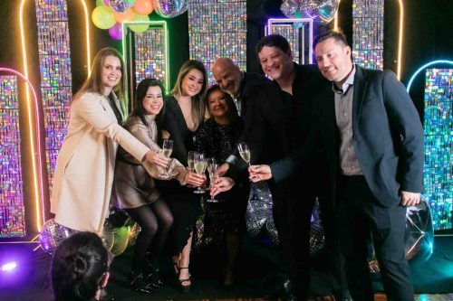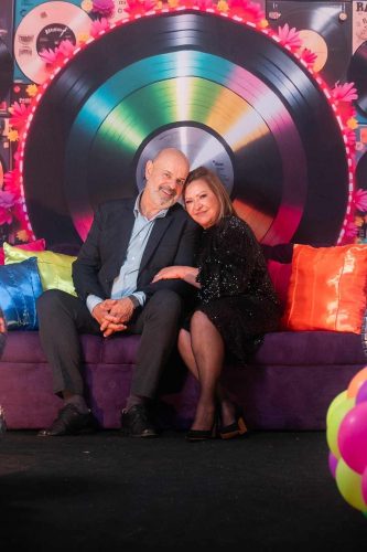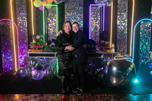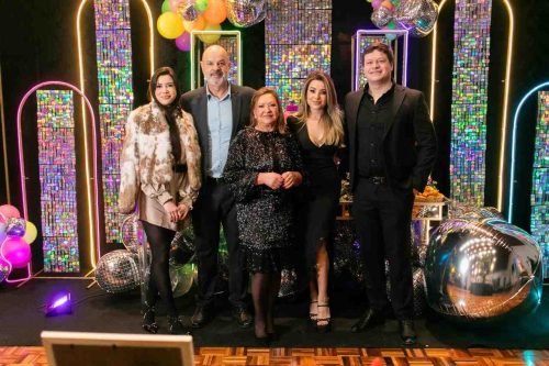 A decoração, assinada pela talentosa designer Marilu Maldaner, da Marilu Decoração e Eventos, transformou o ambiente com globos de espelhos, luzes de neon, discos coloridos e elementos que resgataram, com charme, o clima da época.